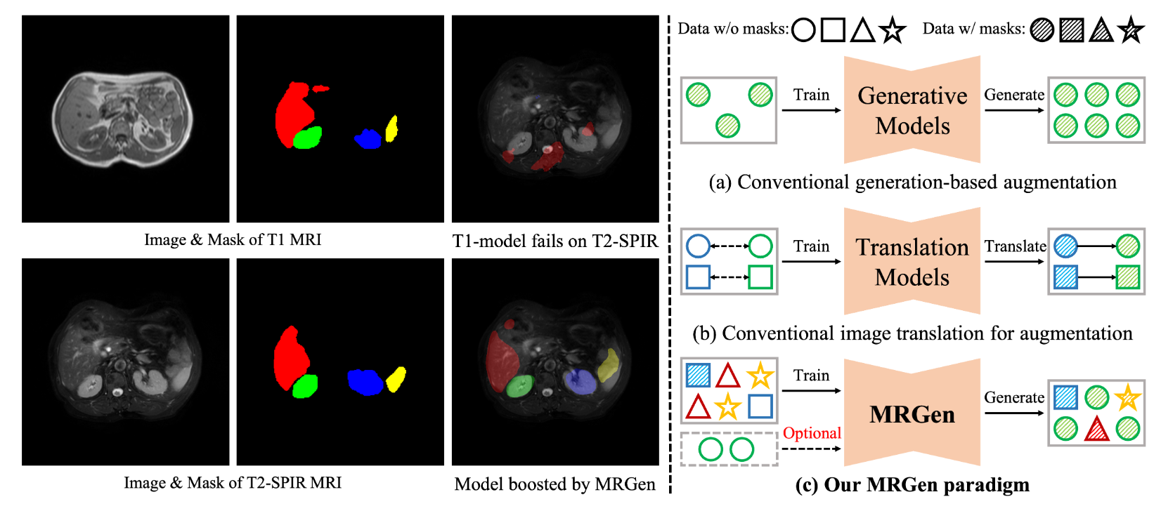 In this paper, we propose MRGen, which can controllably synthesize data for unannotated modalities, without requiring registered data pairs, and extend segmentation models to unannotated modalities.